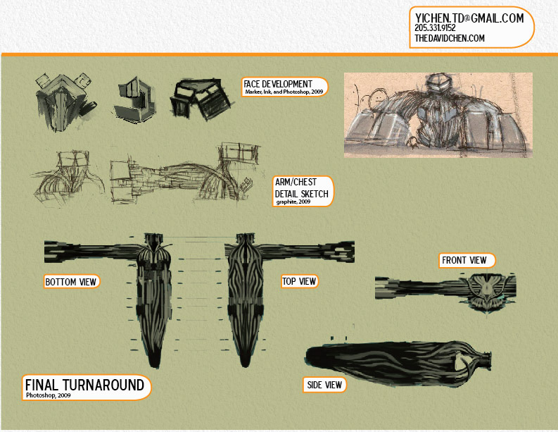 My senior thesis film, I designed and completed the entire two minute short in twenty weeks with a crew of twenty-eight artists. All assets were designed by me.
